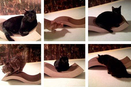 As these photos show, everyone absolutely loves it. And I have to say, it is exquisite. First of all, the packaging it comes in is beautiful. The plain brown cardboard box, simply printed with black ink, is wonderfully designed with great graphics and typography. When you take the lounger out of the box it is immediately obvious that this is a handcrafted, high-quality piecenot just another cardboard scratcher. It truly is a work of art. And the cats were instantly drawn to it, rubbing and sniffing and generally checking it out. We are very happy with this new addition to our home.